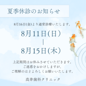 8月11日(日曜日)~15日(木曜日)を夏季休診とさせていただきます。